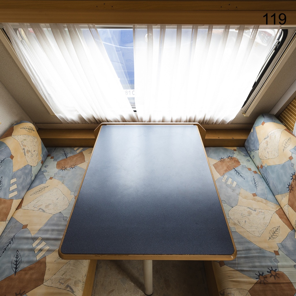 В Кампер прицепе S размещен просторный мягкий уголок со столом. Уголок с легкостью можно трансформировать в двуспальную кровать.